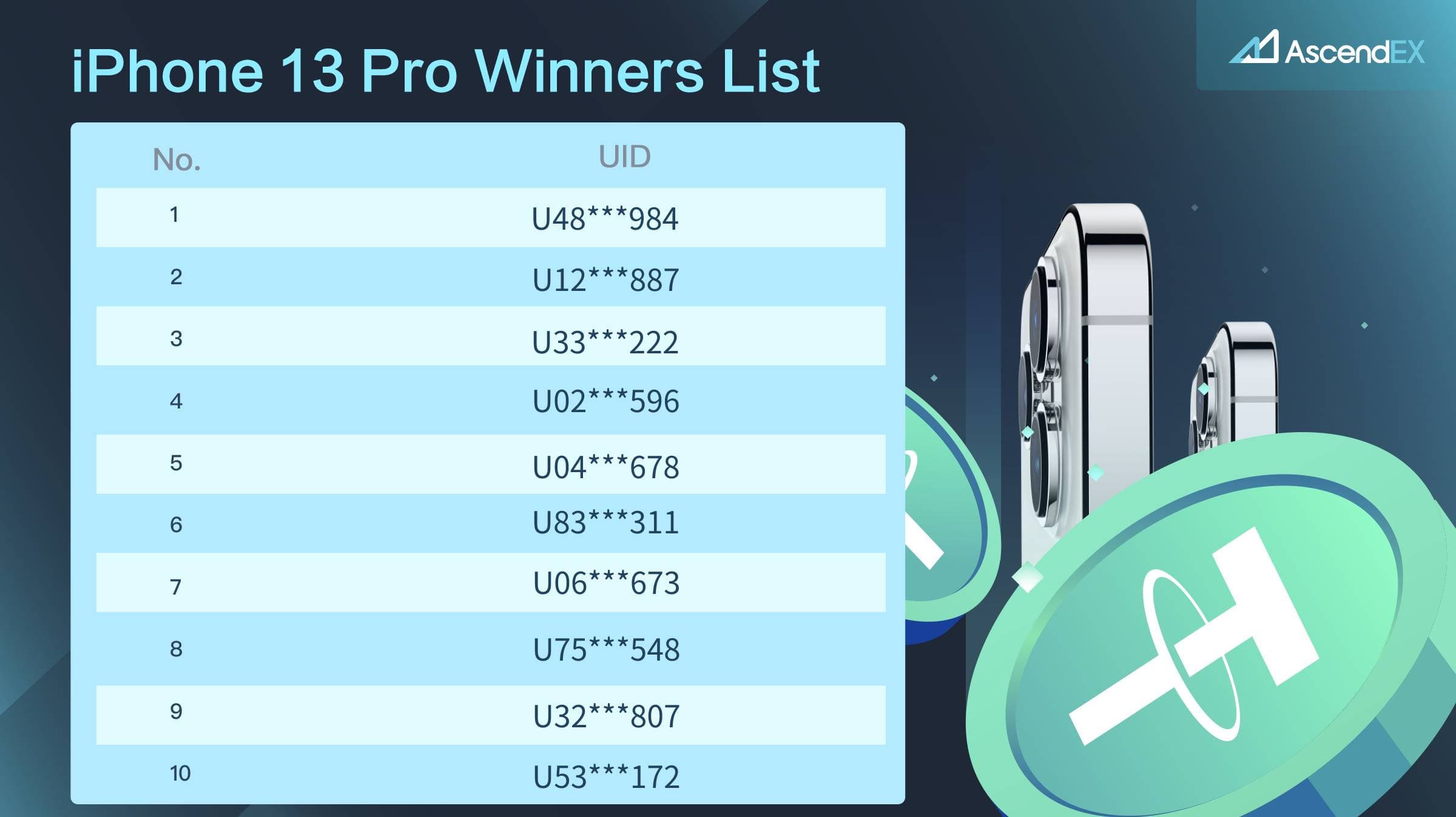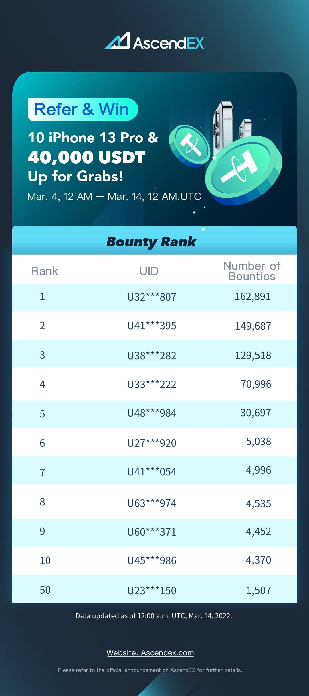 In appreciation of your continued support, AscendEX will launch a limited-time referral event. By referring friends and completing tasks, both referrers and referees will be given a chance to share 40,000 USDT worth of rewards and 10 iPhone 13 Pros.