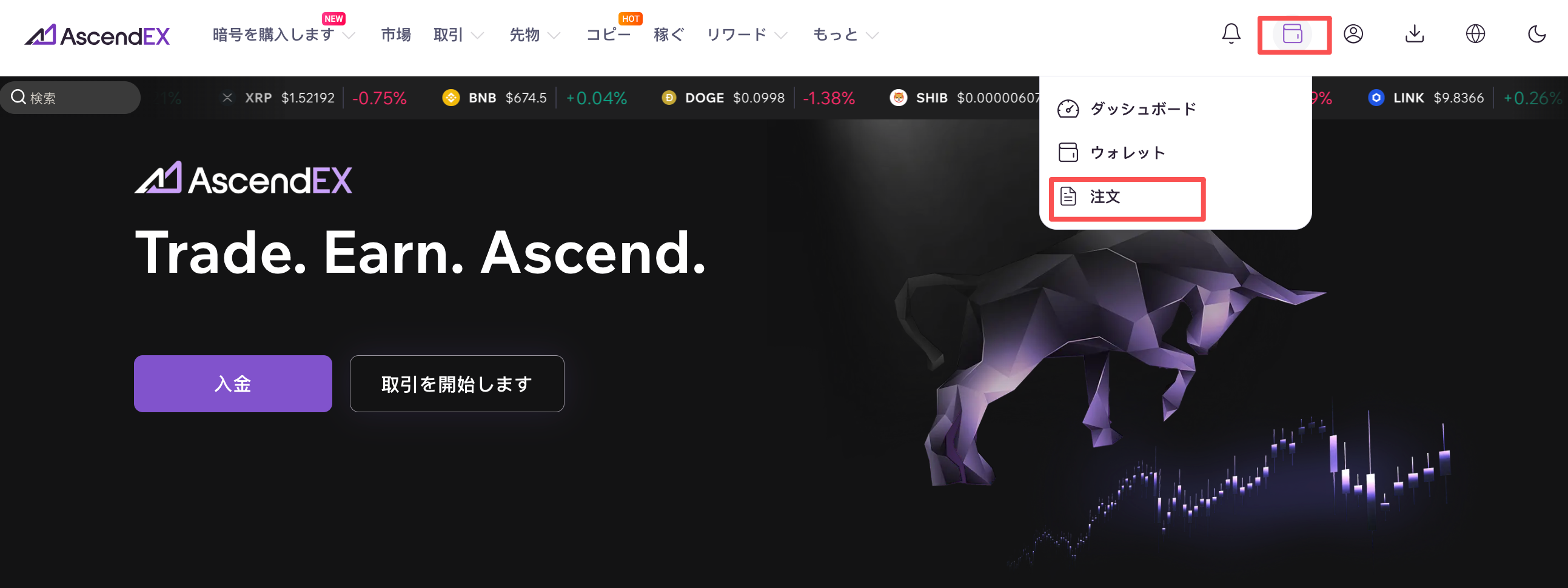 1.     AscendEX ウェブサイトにログインし、ホームページの右上にある「注文」をクリックします。ドロップダウンメニューで「現金取引注文」を選択します。
