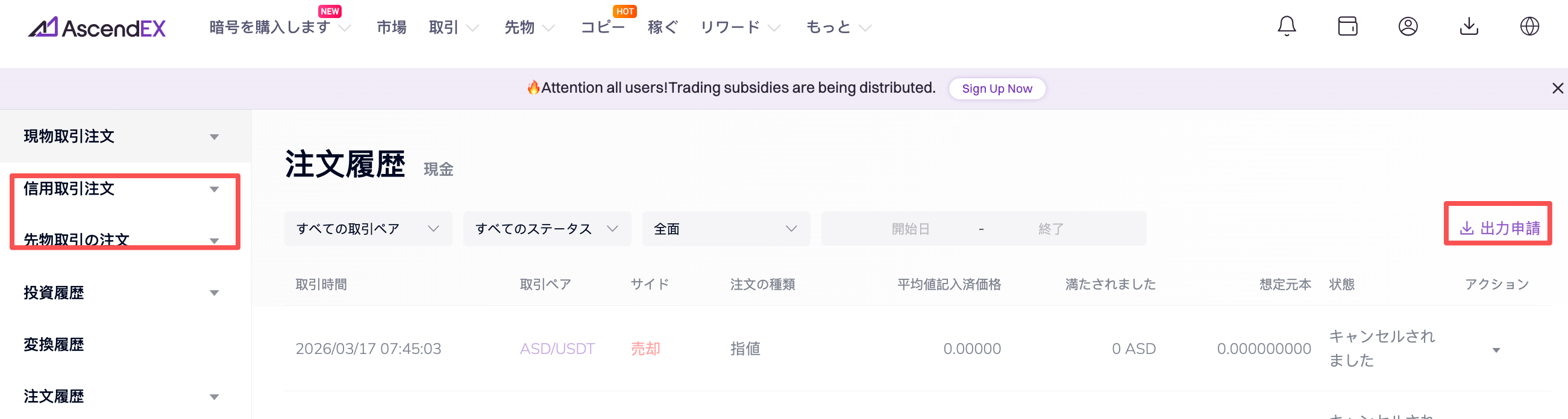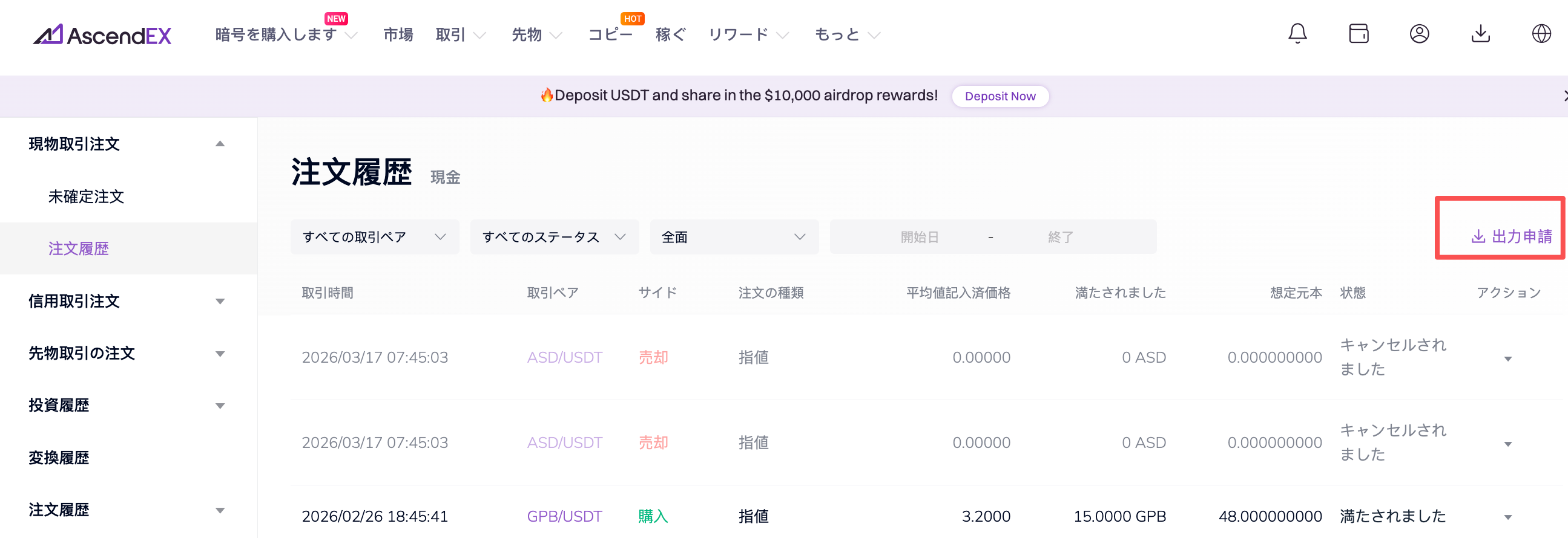 1.     AscendEXでは、現金取引注文、信用取引注文、先物取引注文の3種類の注文履歴をエクスポートすることができます。