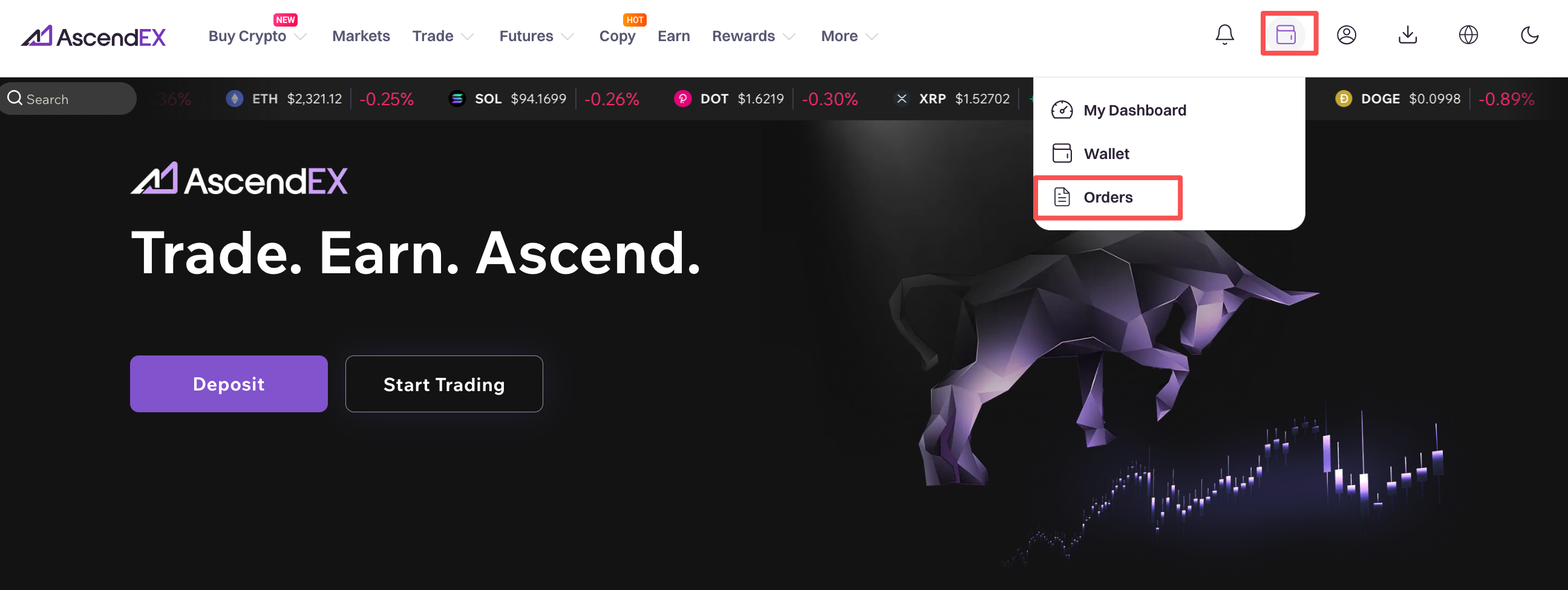 1. Log in to AscendEX website and click on Orders in the upper right corner of the homepage. Select “ Orders” in the dropdown menu.