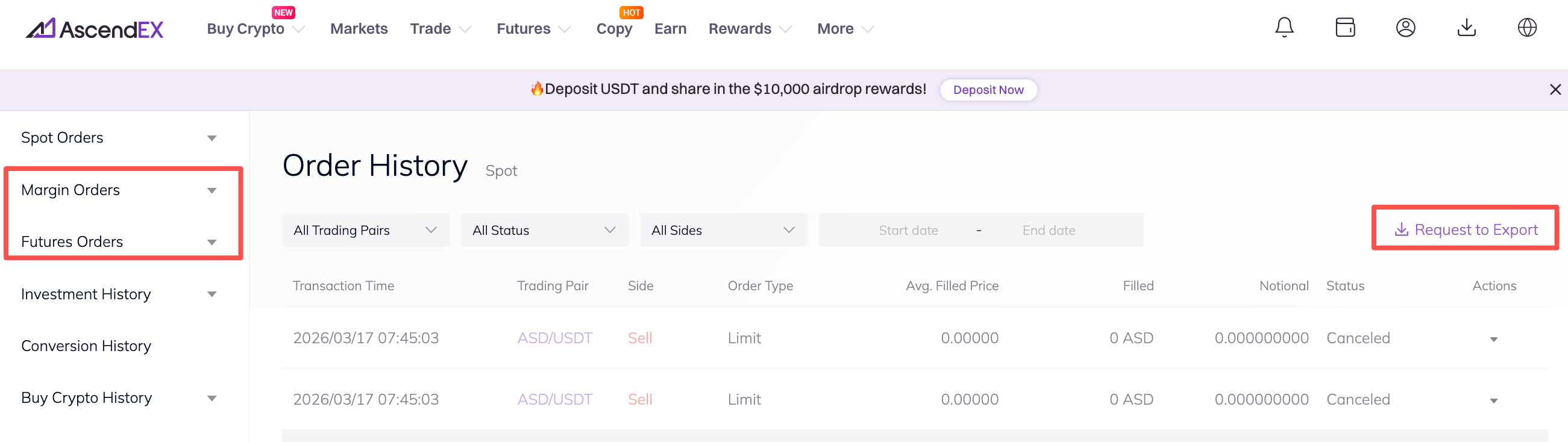 1. AscendEX supports exportation of three types of order history: cash orders, margin orders and futures orders.