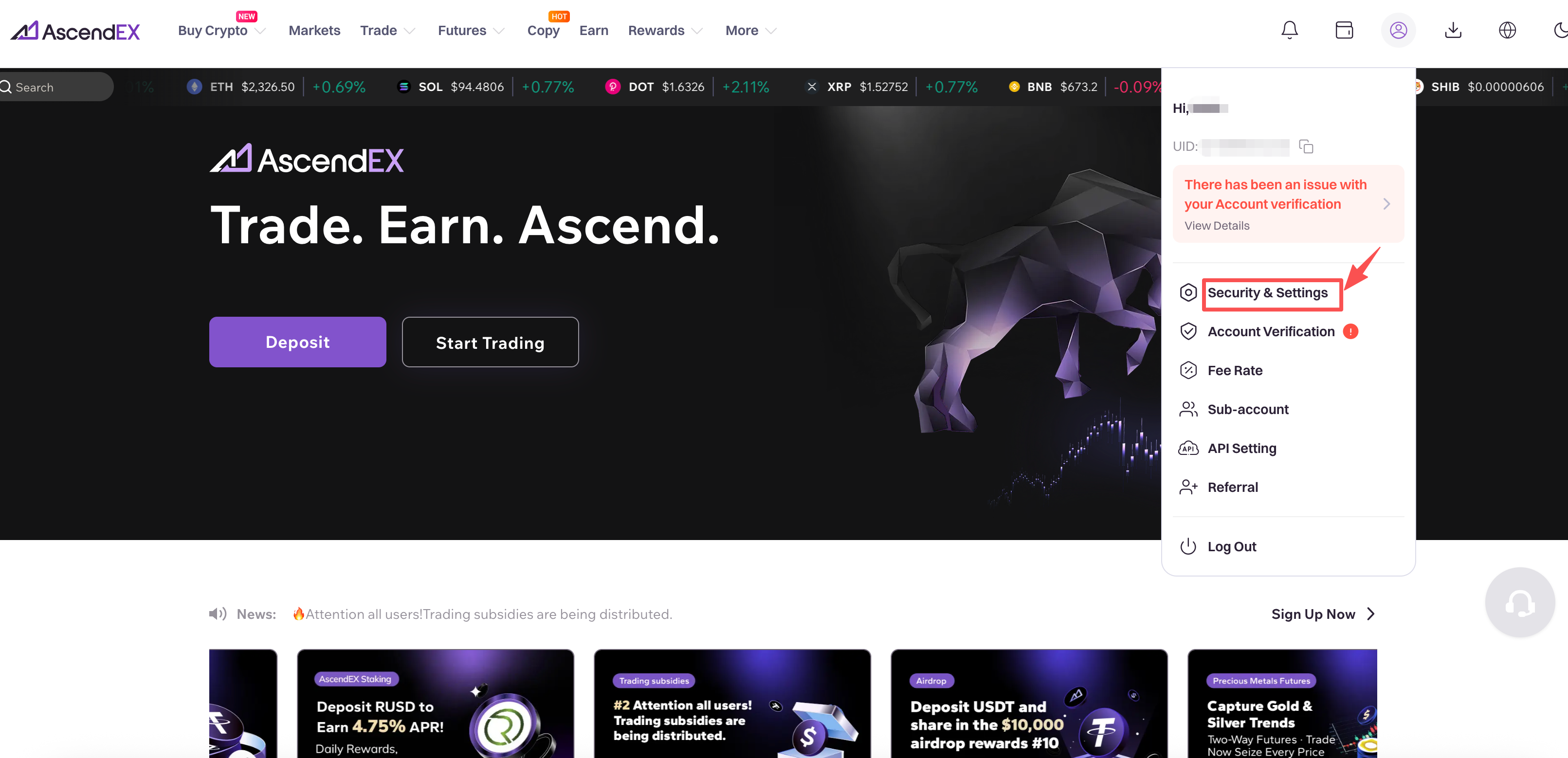 1. Users should log in to their AscendEX accounts on their PC, click the profile icon on the upper right