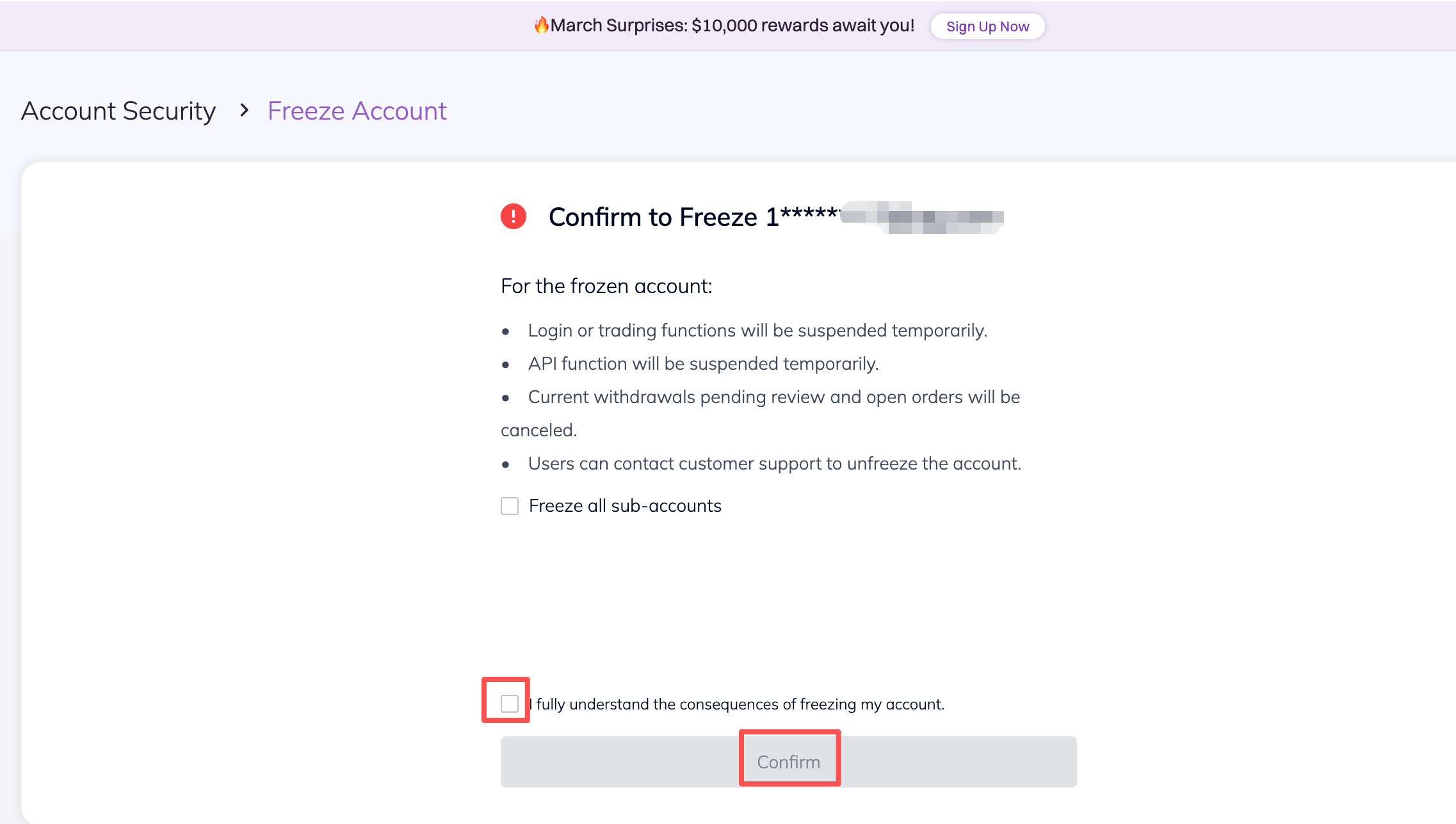 3. Users need to confirm to freeze account on the Freeze Account page by checking “I fully understand