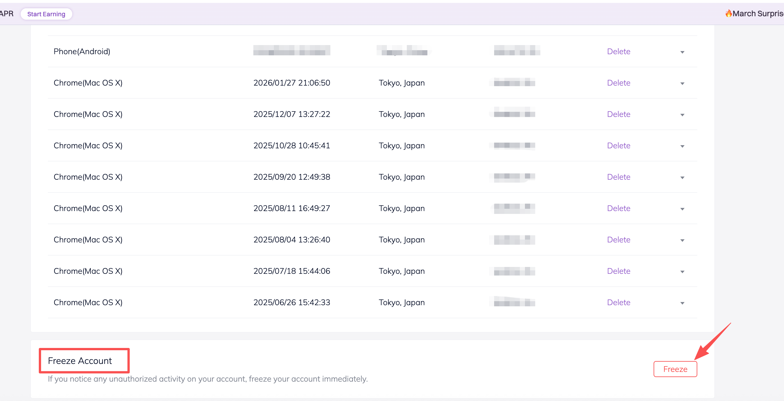 2. Find the [Freeze Account] tab at the very bottom of the Security&Settings page and click [Freeze].