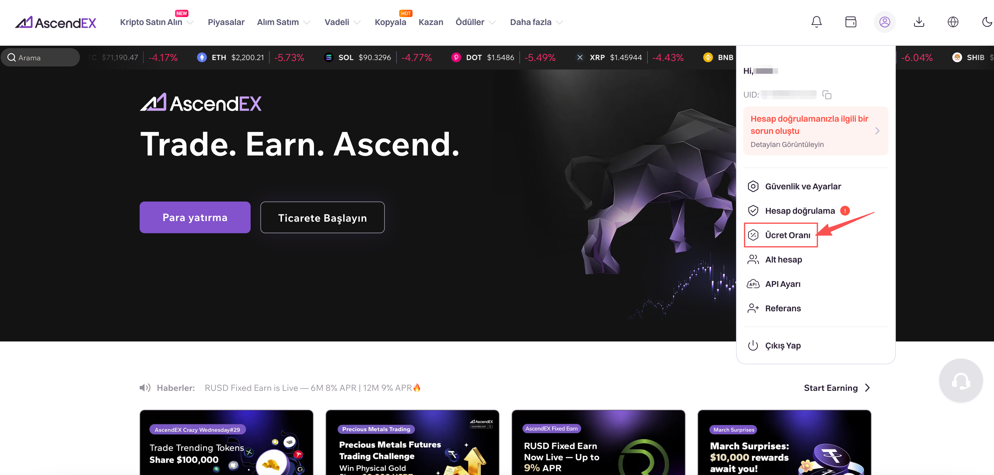 1. Bilgisayarınızda AscendEX hesabınıza giriş yapın ve ana sayfanın sağ üst köşesindeki profil simgesine tıklayın. Açılır menüden “Ücret Oranı”nı seçin.