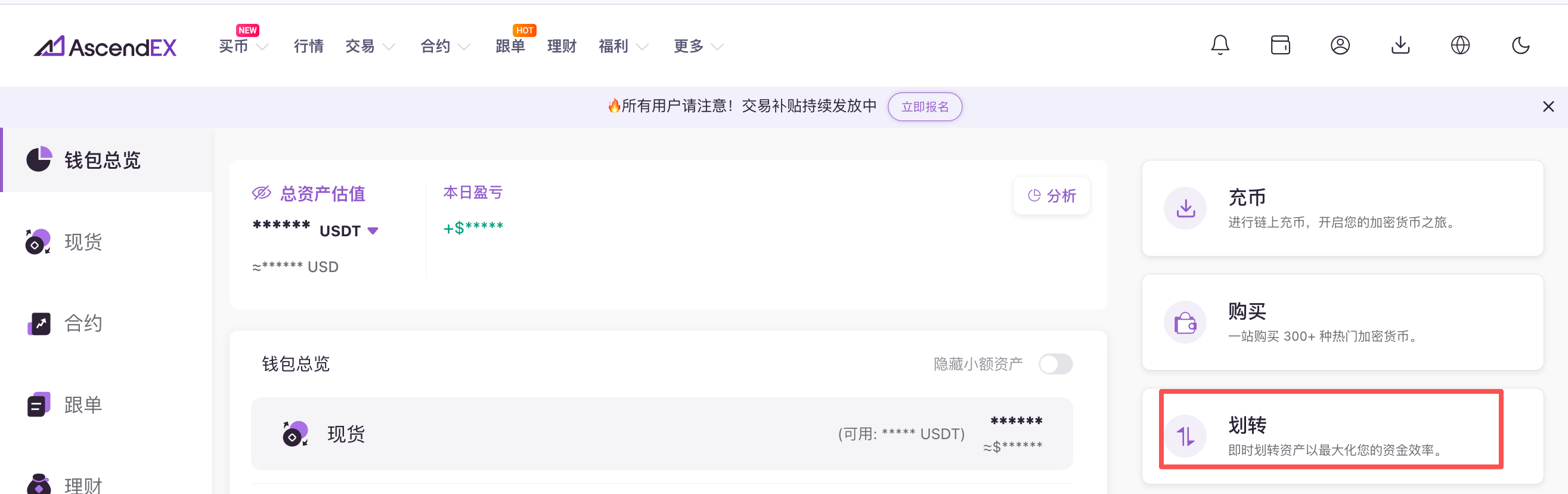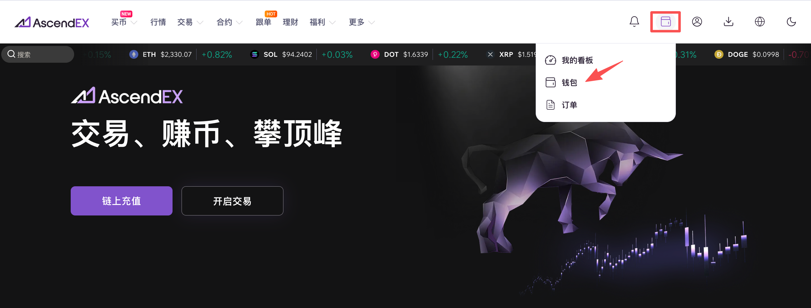 1.以将现货资金划转至杠杆账户为例,打开AscendEX官网,点击首页右上角菜单,在下拉列表中选择钱包。