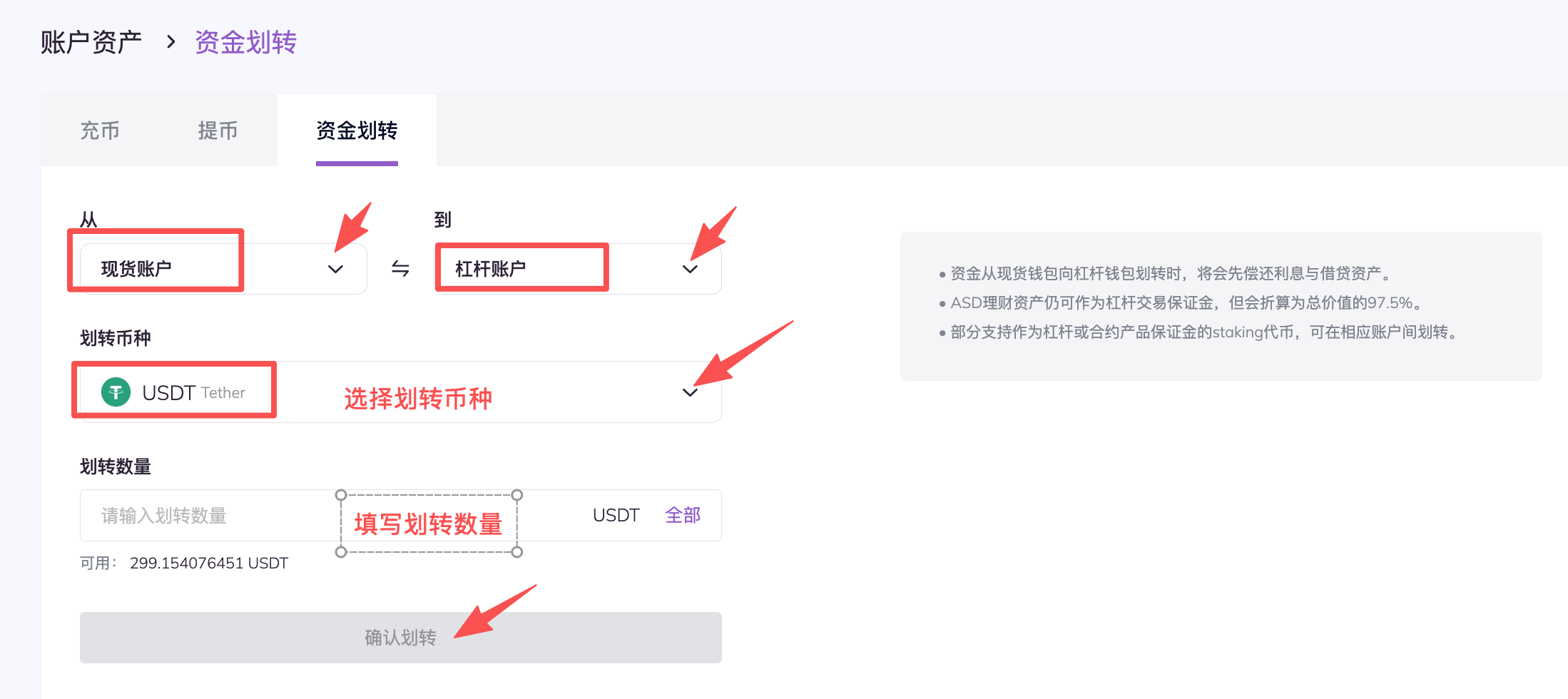 3.进入资金划转页面,选择从现货账户划转至杠杆账户,点击下拉列表选择需要划转的币种,填入需要划转的数量,随后点击确认资金划转,即可完成划转。