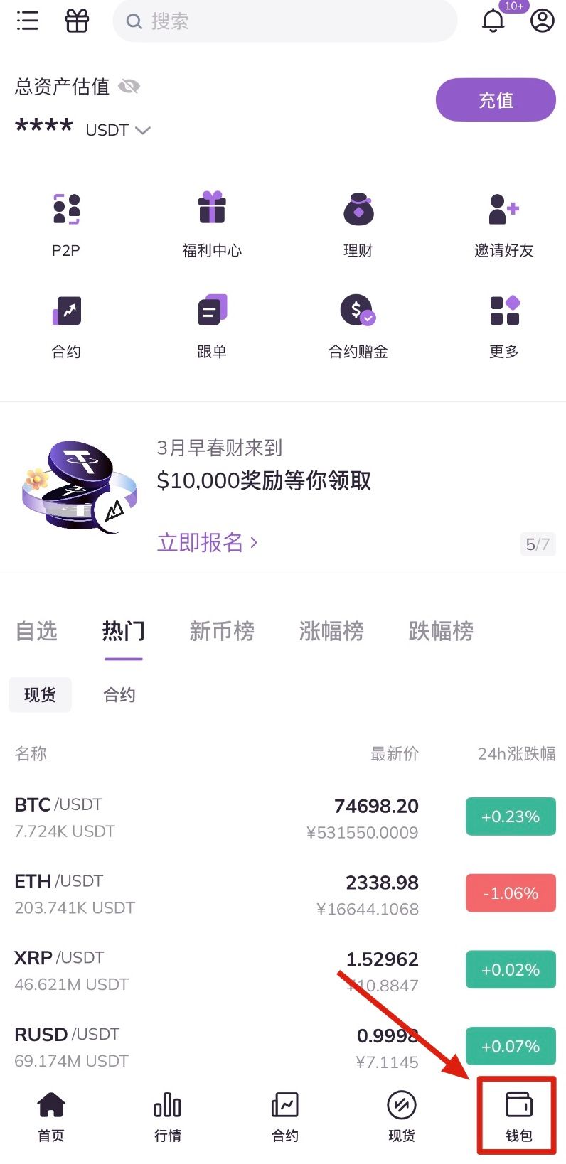 1.打开顶峰AscendEX APP,点击首页右下角钱包。