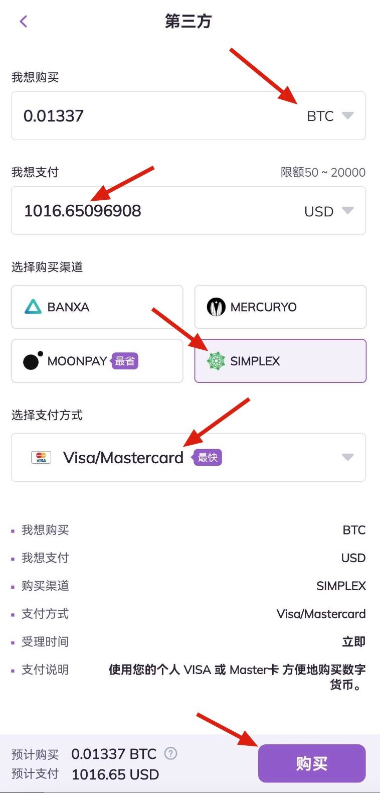 2.进入买币页面,选择想要购买的币种和用以支付的法币,填入对应的法币总金额,选择支付渠道Simplex和Simplex支持的支付方式。确认购买币种数量和法币总金额信息后,点击页面最下方购买按钮。