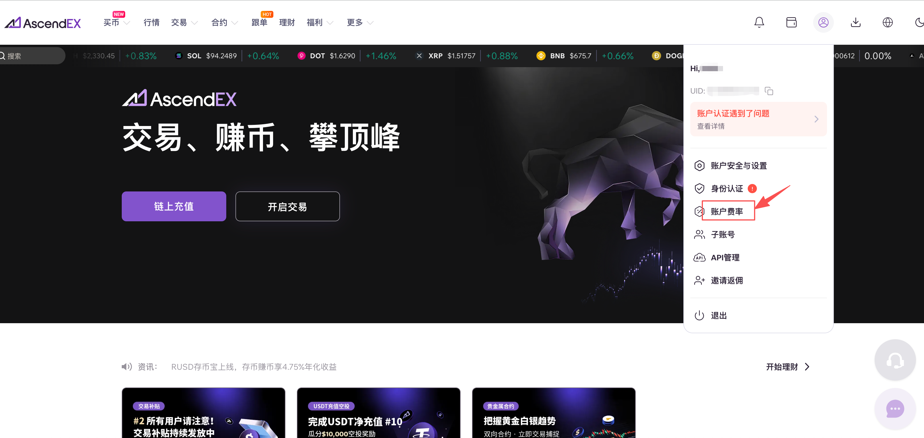 1. 打开AscendEX官网,点击首页右上方个人头像,在下拉列表中选择账户费率