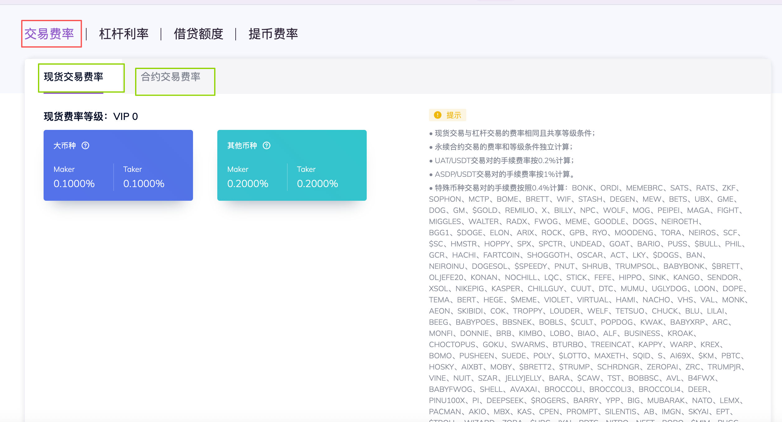 2.进入账户费率页面,可查询您的账户现货交易费率;点击合约交易费率可对应查询合约交易费率。与此同时,您还可以点击杠杆利率借贷额度提币费率,查询对应费率详情。