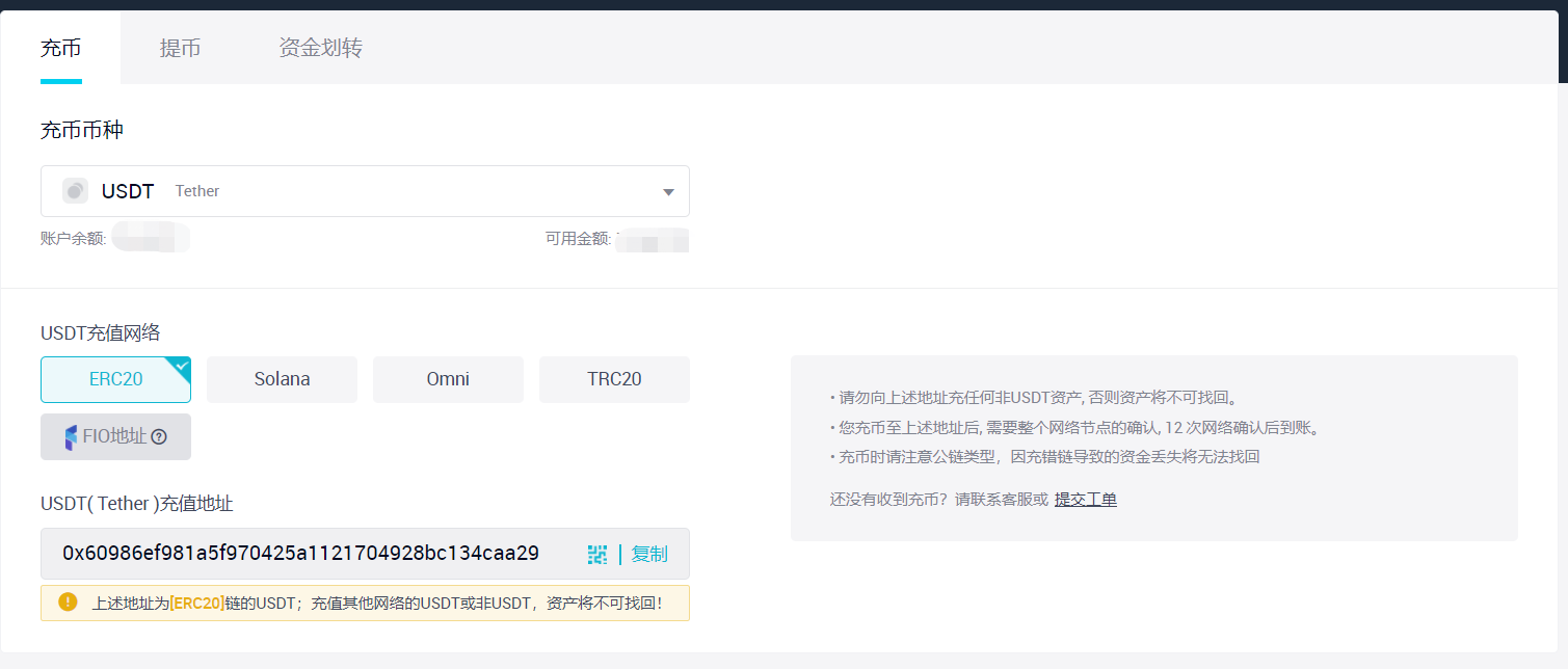 用户在充值USDT时,选择不同的“链名称”将出现不同链的充值地址。请在充值前仔细检查充值地址是否正确,否则可能致使充值资产无法找回。