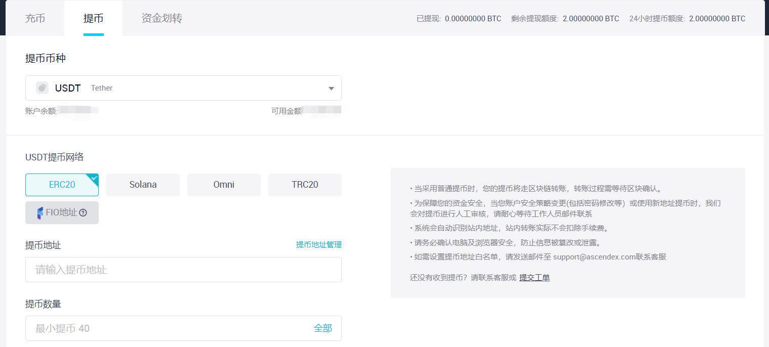 用户在提现USDT时,需选择不同的“链名称”并输入对应提币地址。请在“确认提现”前仔细检查提现地址与“链名称”是否对应,否则可能致使提现失败。