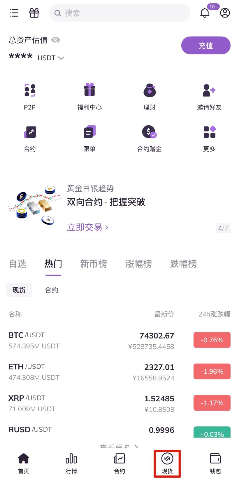 1.在AscendEX上做币币交易,首先进入APP首页。