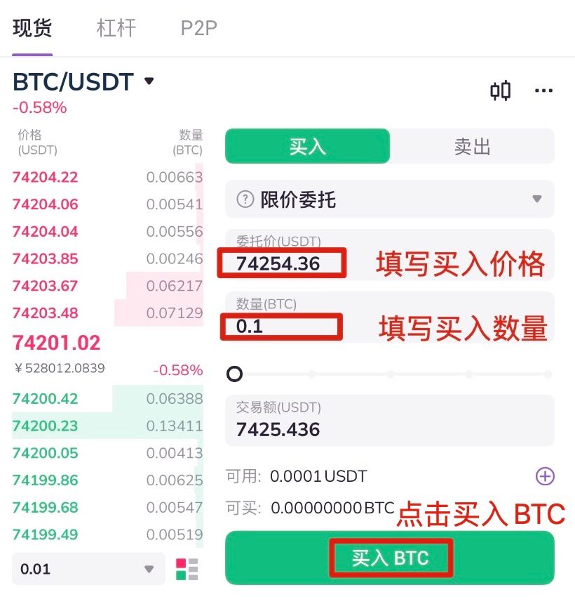 5.选择限价委托(限价单可根据自己的预想价格买入或卖出,市价单可按照当前价格快速成交),填写买入价格及购买数量,点击买入,挂单成功,等待成交即可。订单成交后,可选择限价卖出。