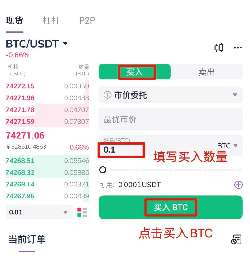 7.以市价买入为例,选择市价委托(限价单可根据自己的预想价格买入或卖出,市价单可按照当前价格快速成交),填写购买数量,点击买入即可成交。