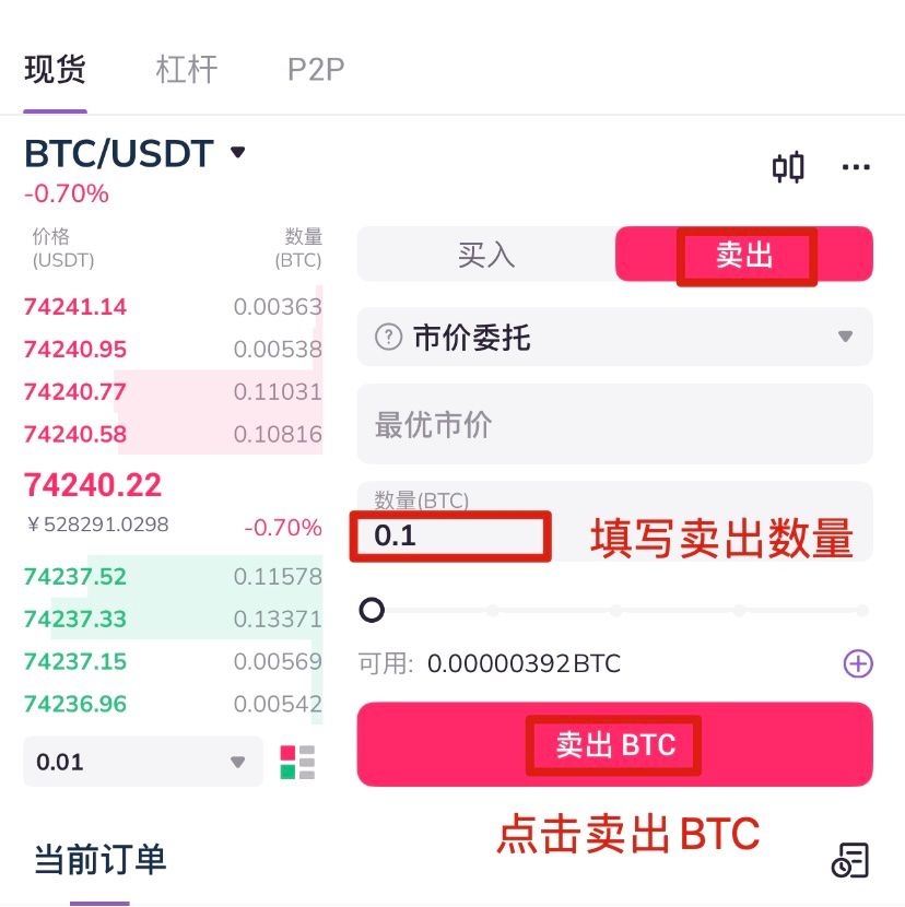 8.选择市价委托(限价单可根据自己的预想价格买入或卖出,市价单可按照当前价格快速成交),填写卖出数量,点击卖出即可成交。