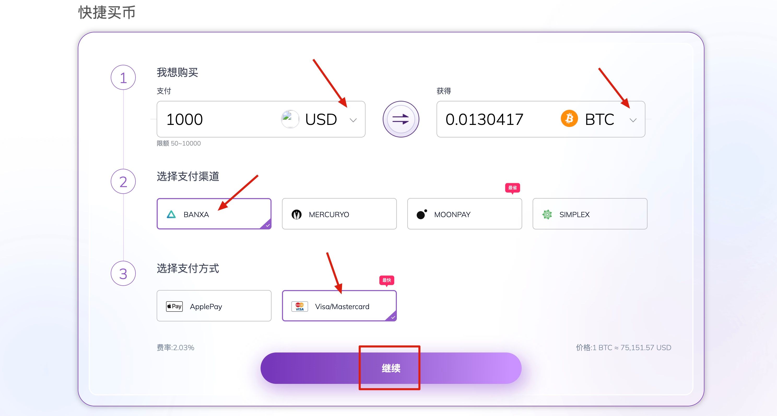 2.进入快捷买币页面,选择想要购买的币种和用以支付的法币,并填入对应的法币总金额,选择支付渠道BANXA和BANXA支持的支付方式。确认购买币种数量法币总金额信息后,点击页面最下方的继续按钮。