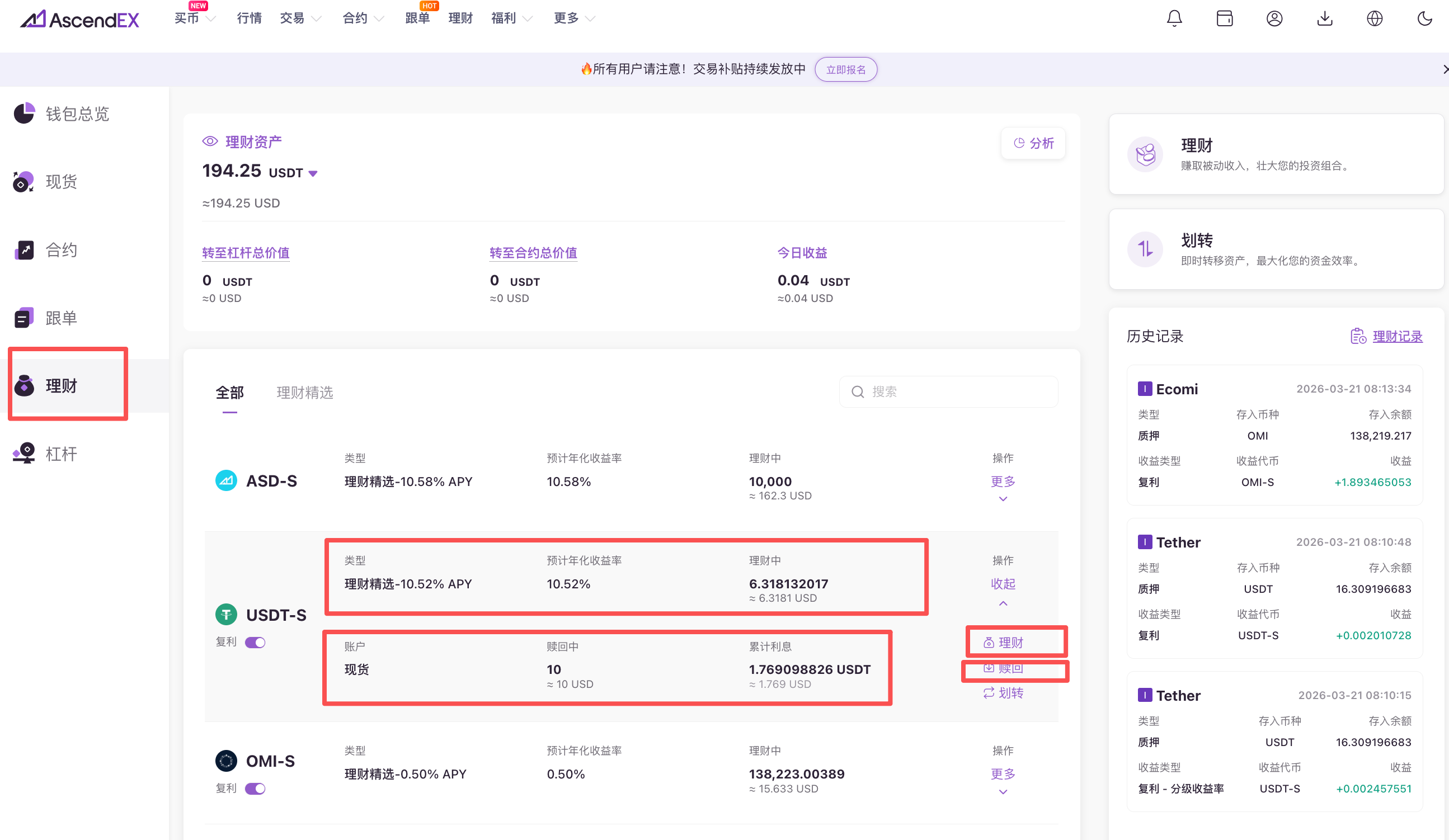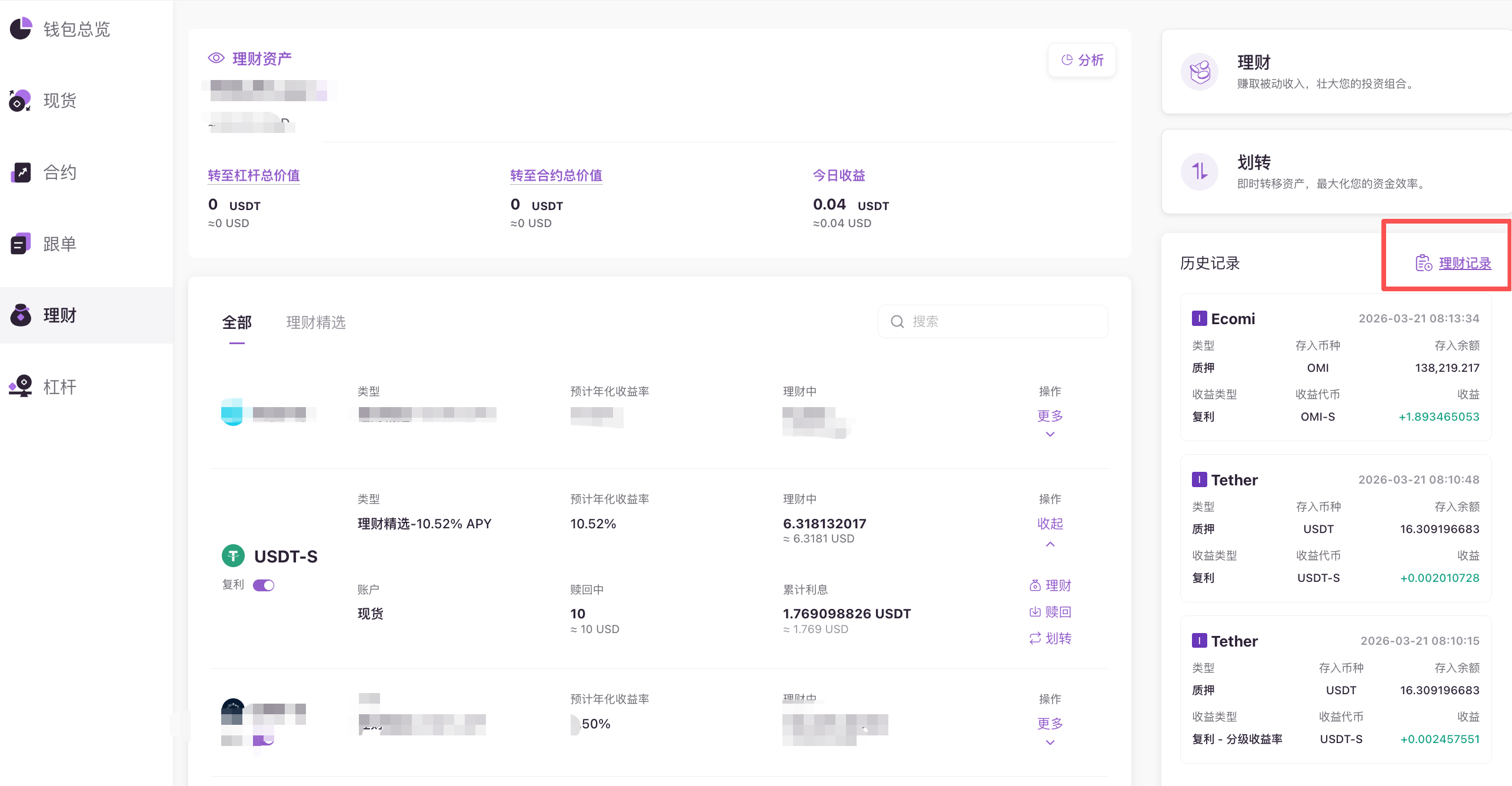 刷新用户可在“首页”→“钱包”→“理财”中查阅所有支持Staking币种的理财、赎回状态及可用余额和累计收益,并可在该页面中直接进行理财和赎回等相关操作。