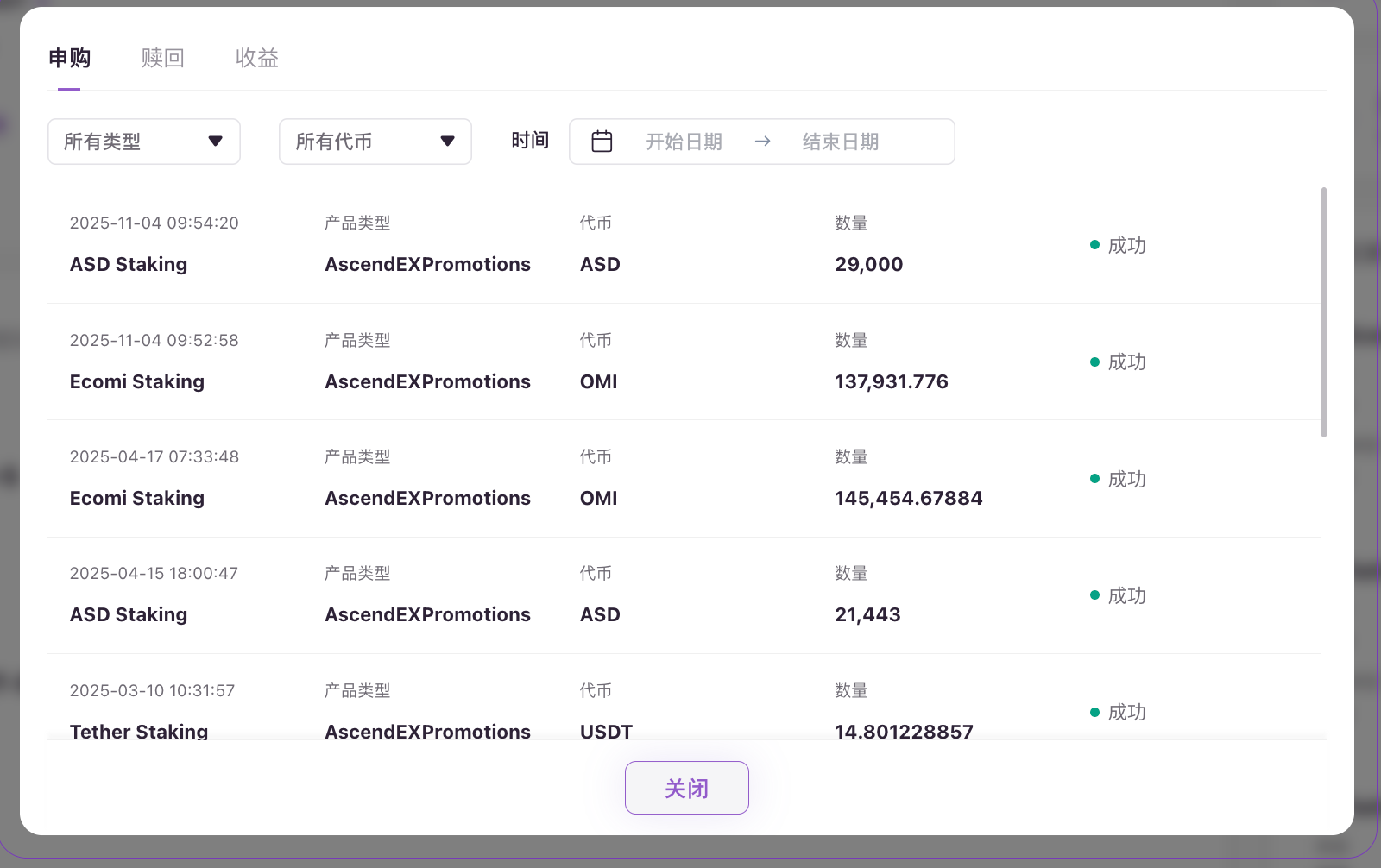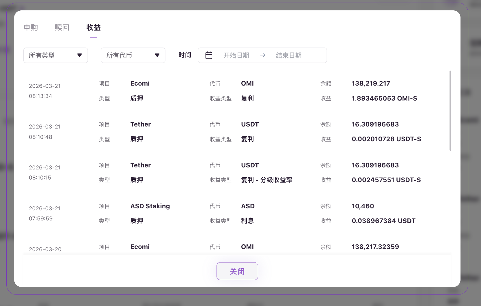 用户可在“首页”→“钱包”→“理财”中查阅所有支持Staking币种的理财、赎回状态及可用余额和累计收益,并可在该页面中直接进行理财和赎回等相关操作。