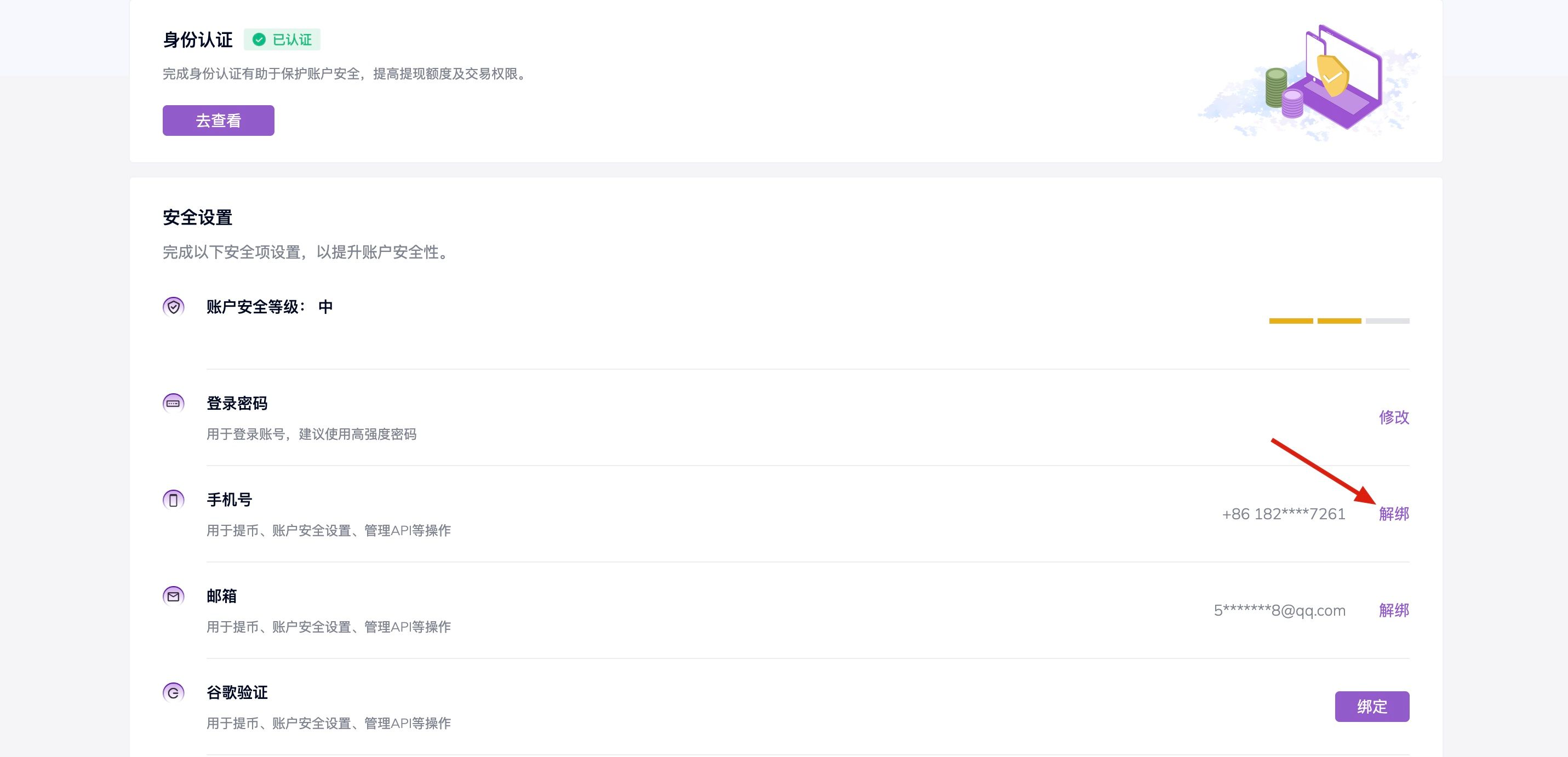 2.进入账户安全页面,找到手机号,点击右侧解绑按钮。