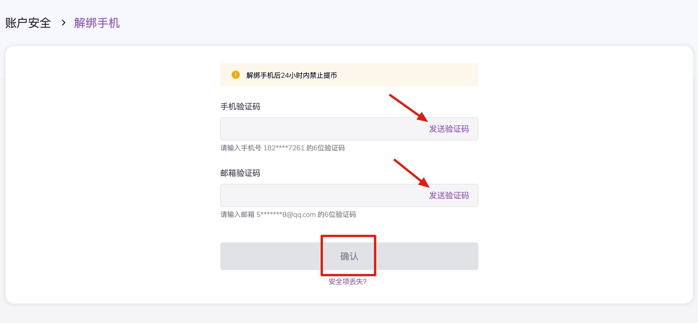 3.进入手机号解绑页面,点击发送验证码,在相应位置填入收到的手机验证码和邮箱验证码,并输入谷歌验证码。最后,点击确认按钮。