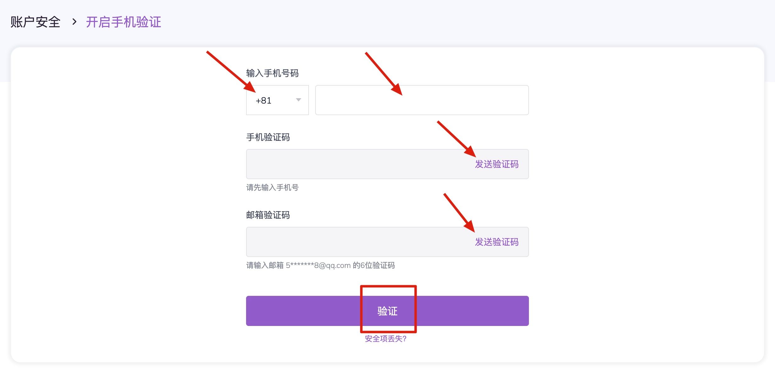 6.进入绑定手机号页面,选择国家/地区,输入手机号,点击发送验证码,并依次输入收到的手机验证码、邮箱验证码,以及谷歌验证码,最后点击验证。验证完成后即完成手机号绑定。