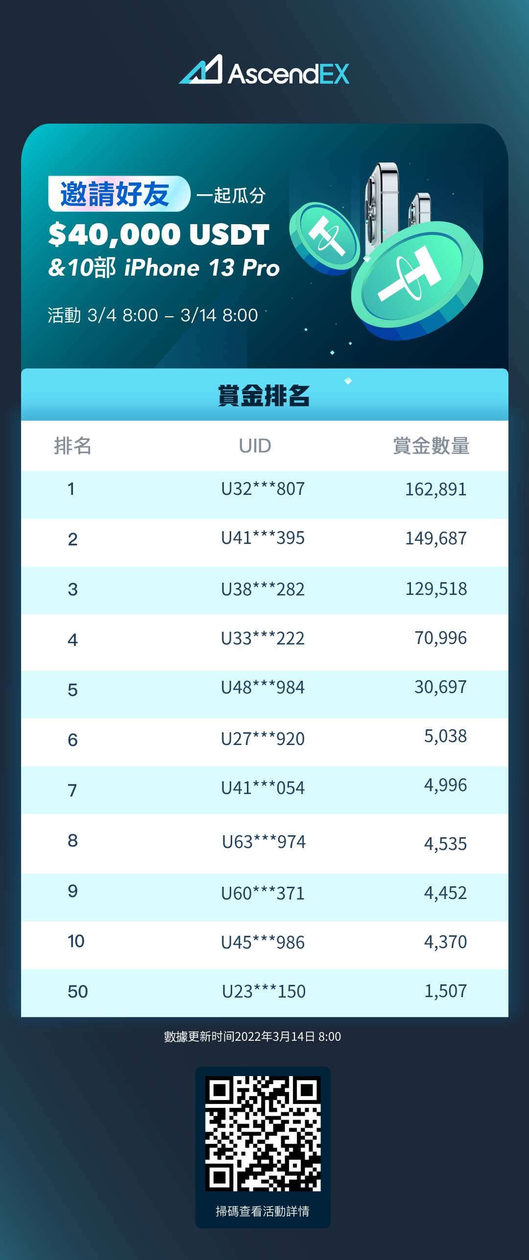 8. 賞金排名將在每個工作日21:00前更新,最終賞金排名和iPhone 13 Pro獲獎名單將在活動結束後更新至公告中;