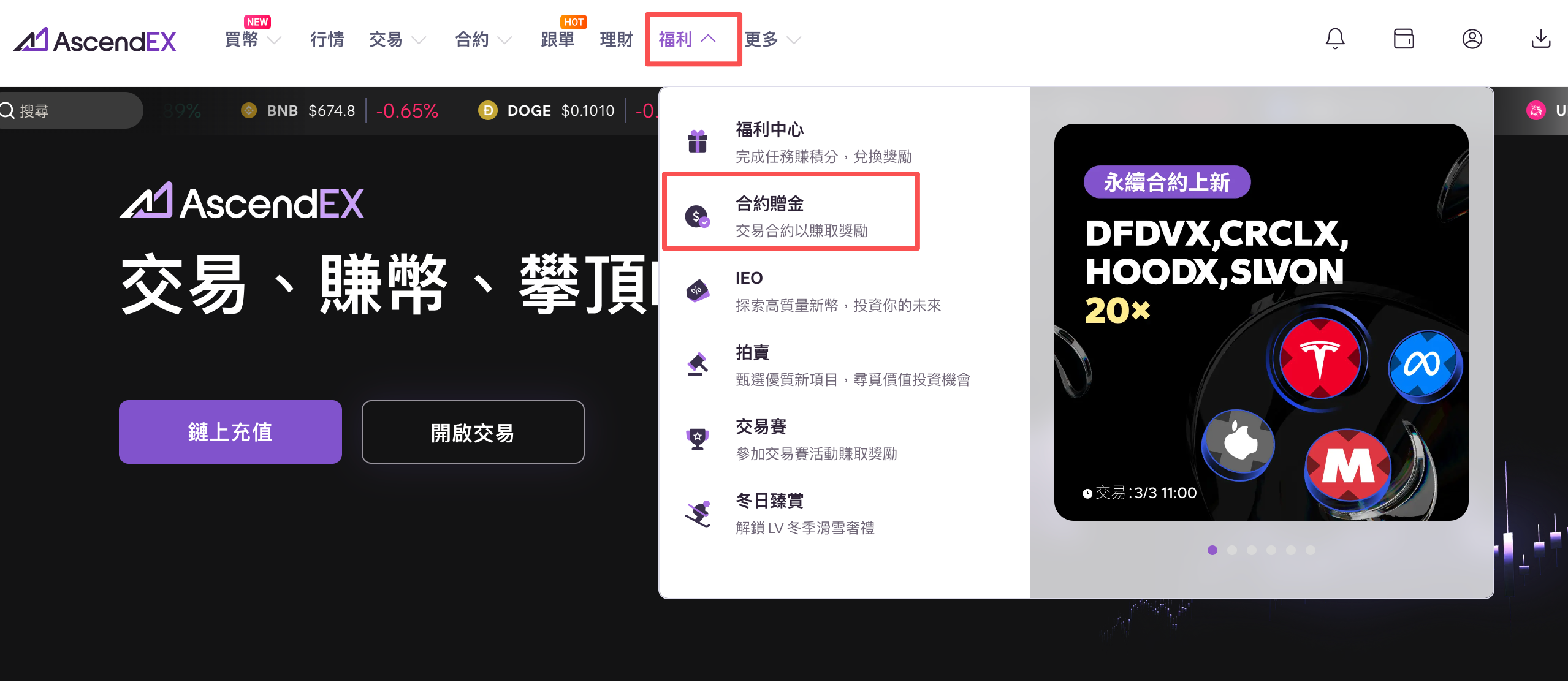 1. PC或APP端登錄頂峰AscendEX賬戶,前往【福利】-【合約贈金】進入活動頁面;